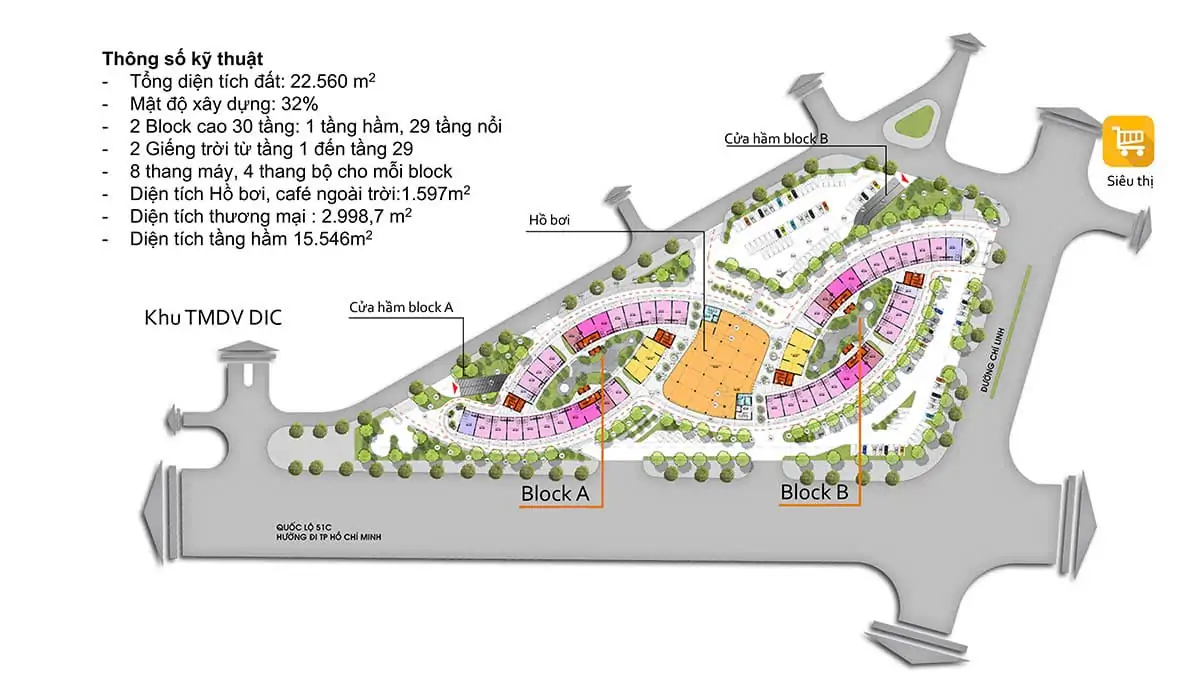 - Quy mô: Quy mô3 block, mỗi block cao 30 tầng gồm 30 tầng nổi (2 tầng thương mại) và 2 tầng hầm, tổng cộng hơn 1.500 căn hộ.